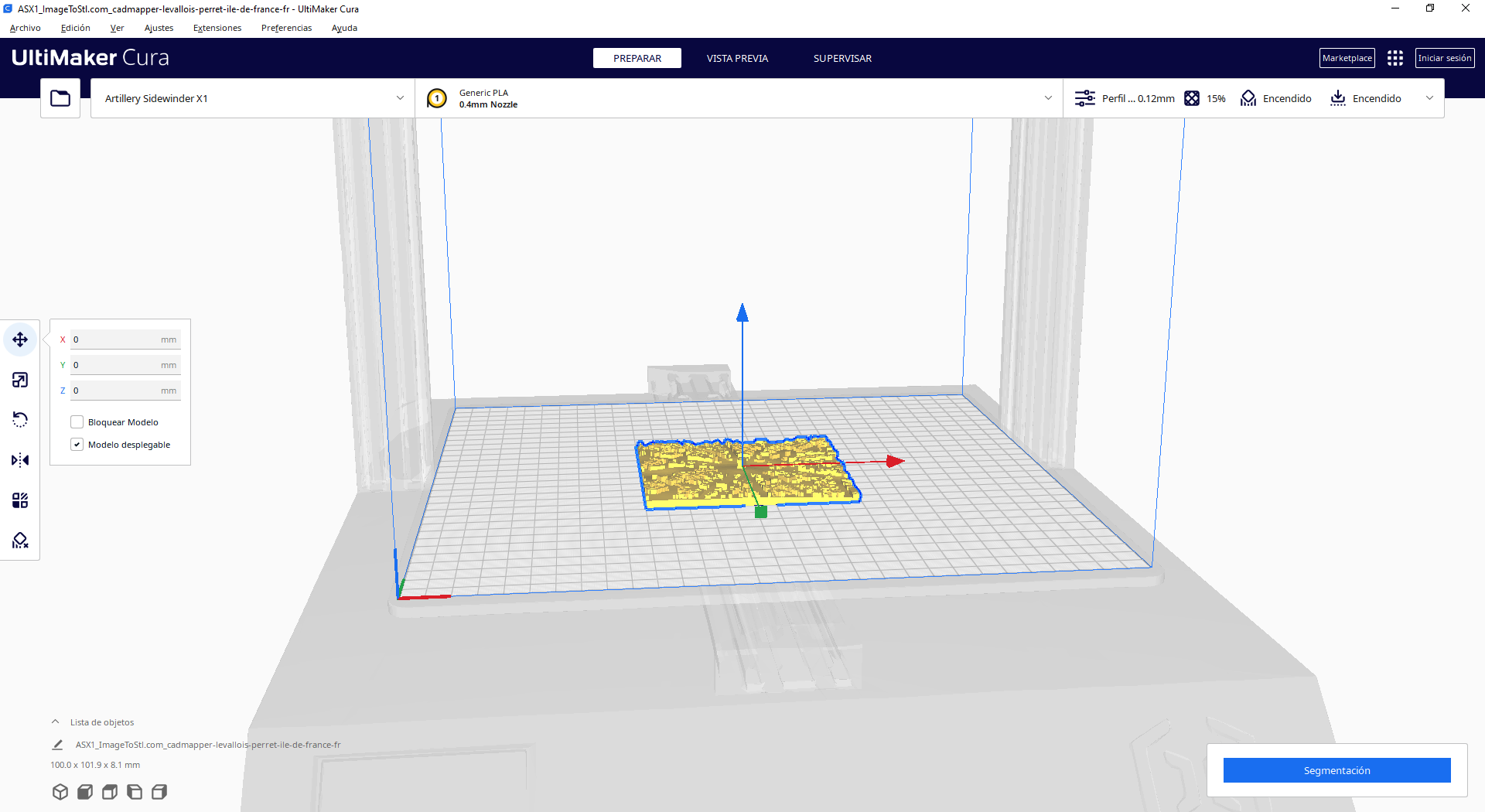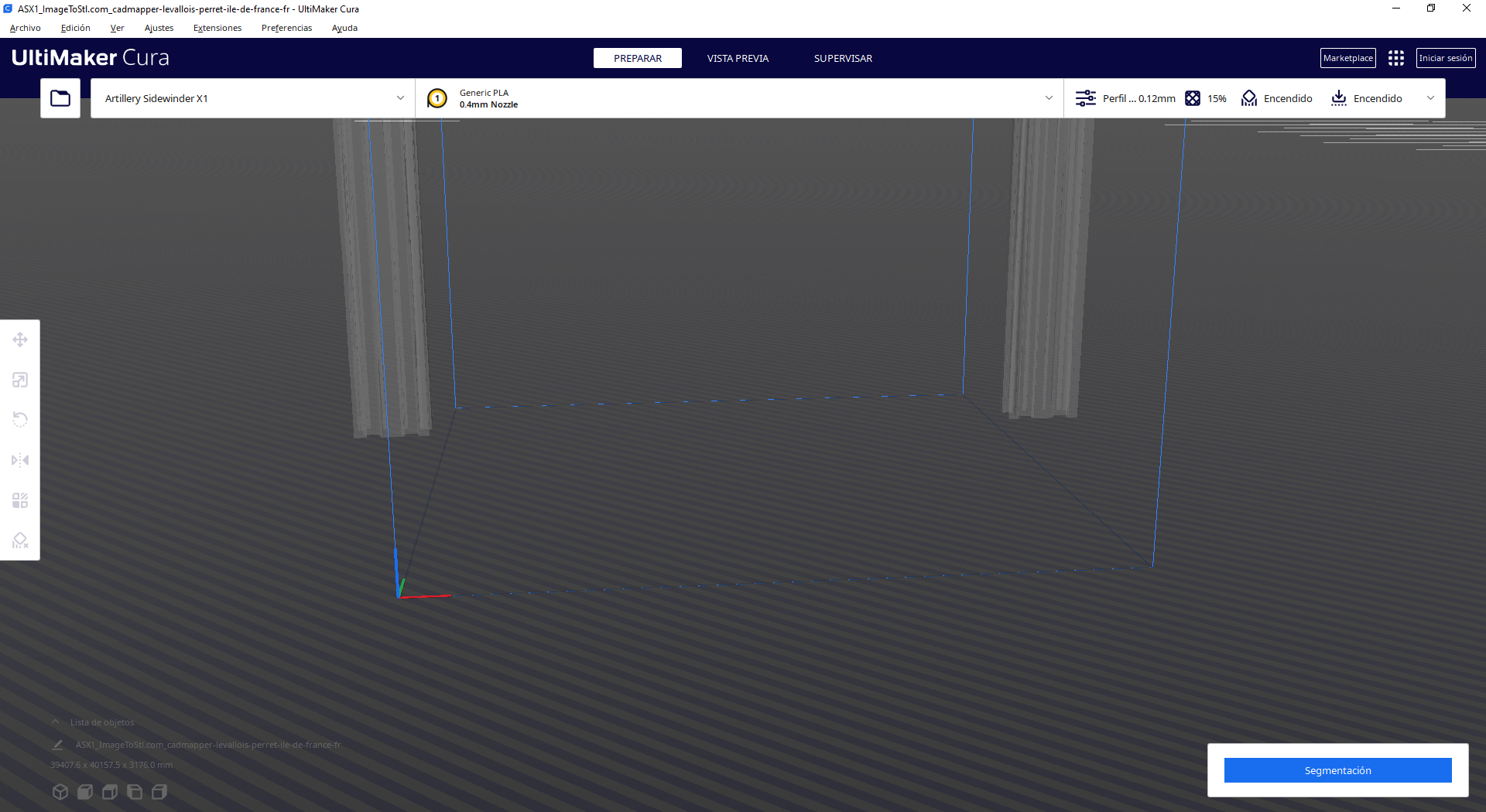• Finalmente, para generar el modelo 3D que se imprimirá, pulsar el botón Segmentación en la esquina inferior derecha de Ultimaker Cura, lo que iniciará el proceso de conversión y permitirá estimar el tiempo total de impresión y consumo de material. Después será posible guardar el modelo en una unidad de almacenamiento USB o en el almacenamiento interno del equipo para luego llevarlo a la impresora y materializar el modelo.