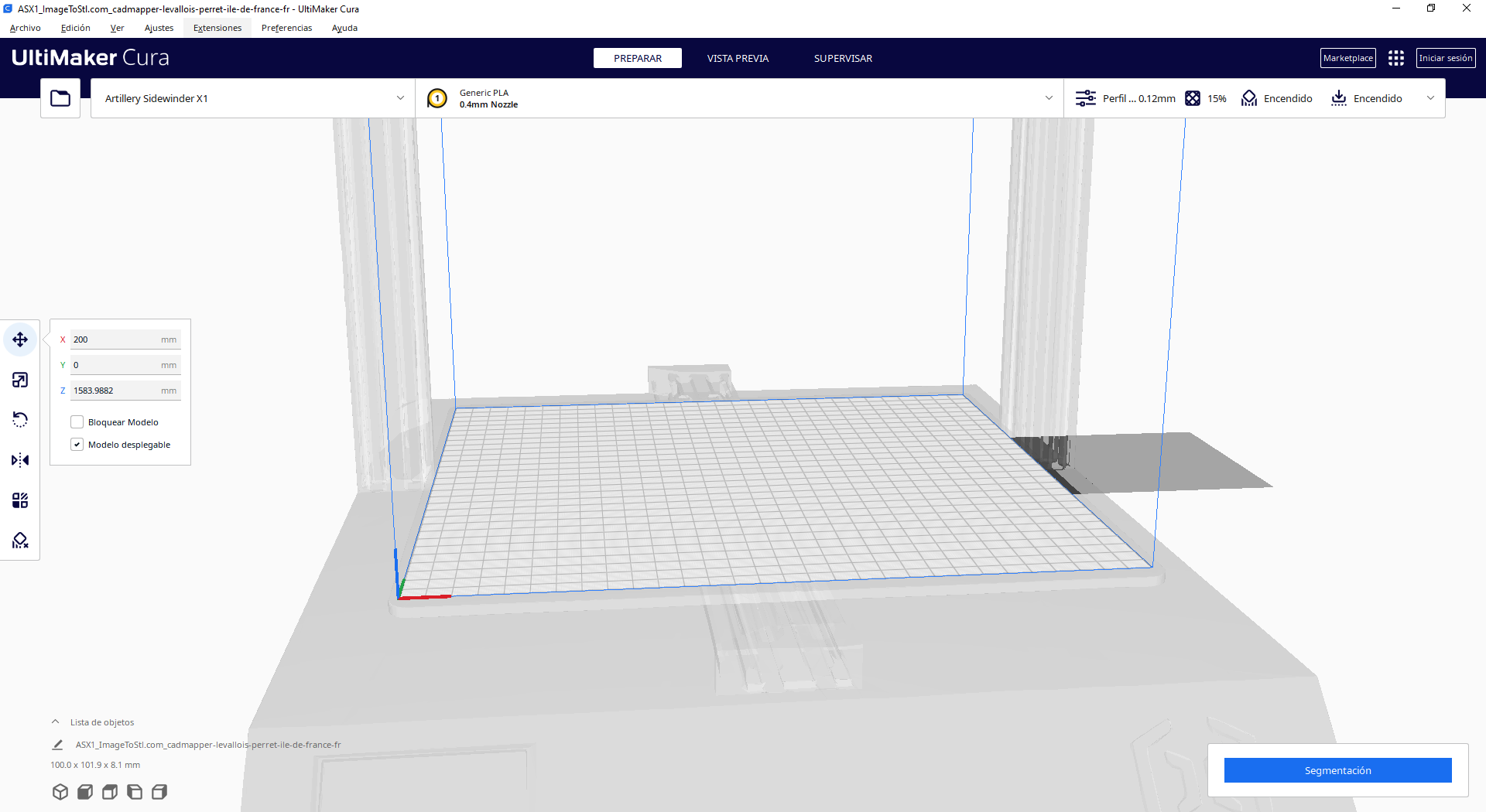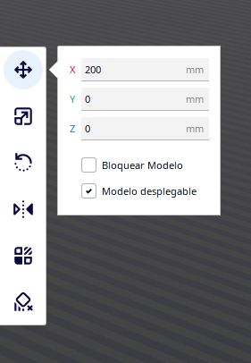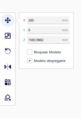• Tras escalar la figura, esta podrá quedar fuera del área de impresión, por lo cual debe ser movida. Para ello, pulsar el botón de la barra lateral para modificar la posición espacial de la figura, remplazando los valores de los campos X, Y y Z a 0, lo que hará que la figura quede centrada en el área de impresión.